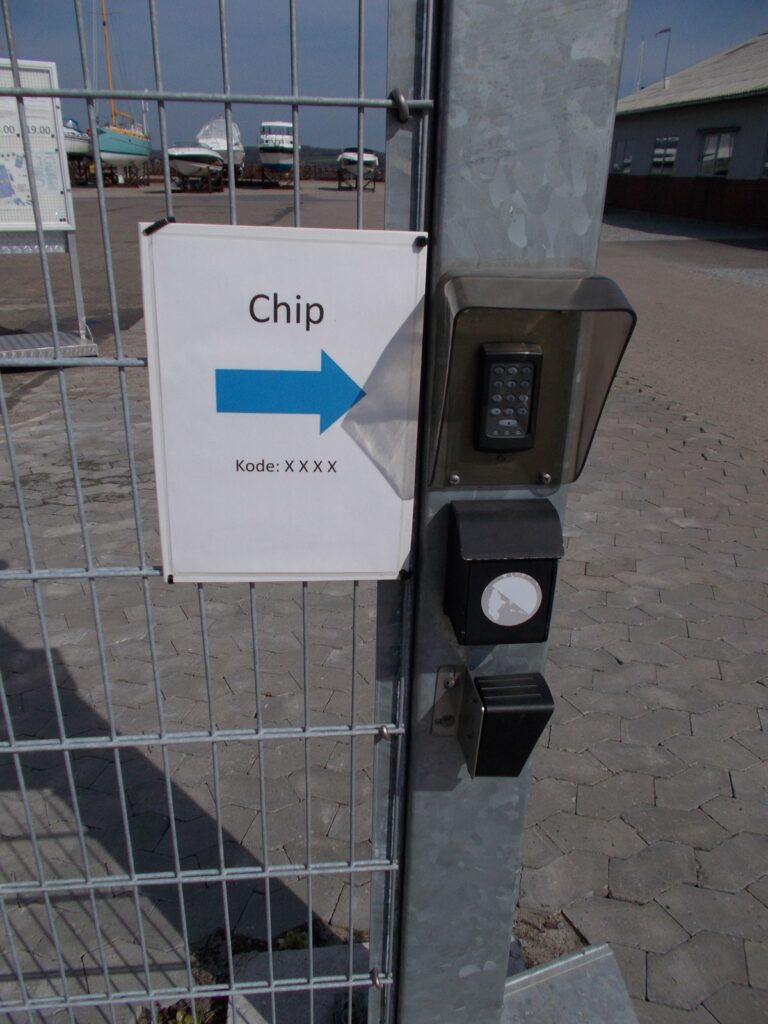 Den elektronisk adgangschip virker som nøgle til pladsen og hallerne med egen personlige kode. Chippen udleveres mod et depositum på kr. 100,00. I åbningstiden – 07.00-20.00 – er porten (6 meter åbning) og hallerne åbne. Åbningstiderne på porten er varierende alt efter årstider og helligdage. Se åbningstider ved indgangen.